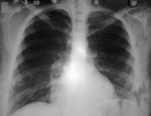 Radiografía de tórax posteroanterior del (16 de diciembre de 2017): discreto reforzamiento de la trama pulmonar en hemitórax derecho y opacidad en velo del hemitórax izquierdo hacia la base con aspecto de condensación inflamatoria.