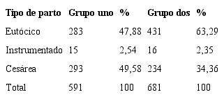 De total de gestantes del grupo uno el 49,58 % fueron cesáreas, seguidas del 47,88 % que tuvieron un parto eutócico; en contraste en el grupo dos el 63,29 % tuvieron un parto eutócico (Tabla 2).