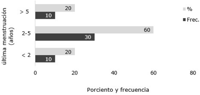Métodos: se desarrolló una investigación cuantitativa con alcance descriptivo y diseño transversal y retrospectivo. La población estuvo constituida por 50 mujeres del barrio La Propicia, cuatro en la ciudad de Esmeraldas, Ecuador. Para la recolección de datos se realizó una revisión de las historias clínicas de todas las mujeres en etapa menopaúsica.