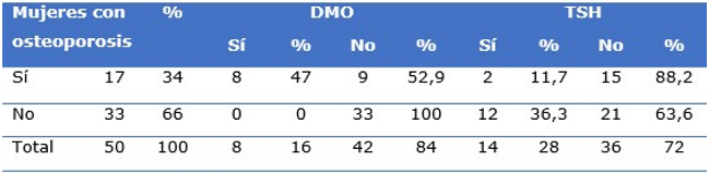 Se observó que el 34 % de la población presentó diagnóstico de osteoporosis, mientras que el 66 % no. El diagnóstico de osteoporosis se realizó por medio de la DMO en el 47 % de los casos. Cabe destacar que el 88,23 % de las mujeres con osteoporosis no siguió tratamiento sustitutivo hormonal (Tabla 1).