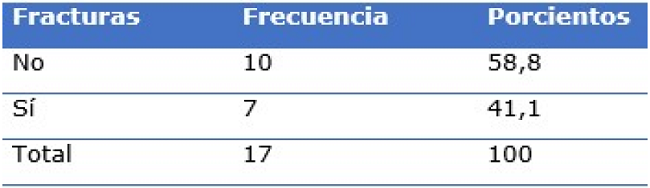 Del total de mujeres con diagnóstico de osteoporosis (17), el 41,18 % (7) sufrió algún tipo de fractura producto de la enfermedad (Tabla 2).