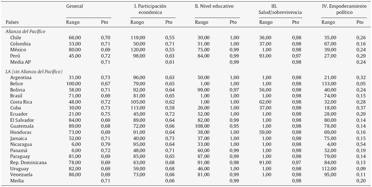 El Reporte global de brecha de género generado por el Foro Económico Mundial (2015) considera el índice de participación y oportunidad económica. Este índice se calcula a partir de tres conceptos: la brecha de participación, la brecha de remuneración y la brecha de avance. La brecha de participación refleja la tasa de participación de la fuerza laboral de las mujeres en relación con los hombres; la brecha de remuneración representa la tasa estimada del ingreso de la mujer en relación con el hombre, así como sondeos que miden el salario igual por trabajo igual, sin distinción de género. La brecha de avance es la tasa que se obtiene al medir mujeres y hombres en el ámbito legislativo, oficial y gerencial, comparándolo con el nivel técnico y de trabajadores profesionales. Como se puede observar en la tabla 2, la columna titulada "I. Participación económica" refleja cómo en el bloque de países de la Alianza del Pacífico (media = 0,61) es menor que en el resto de los países latinoamericanos (media = 0,66). En otras palabras, los países incorporados a la Alianza ofrecen menos oportunidades para incorporar a la mujer en el sector económico, por lo que su brecha es más grande. Es importante aclarar que cuanto menor es el número, mayor es la brecha.