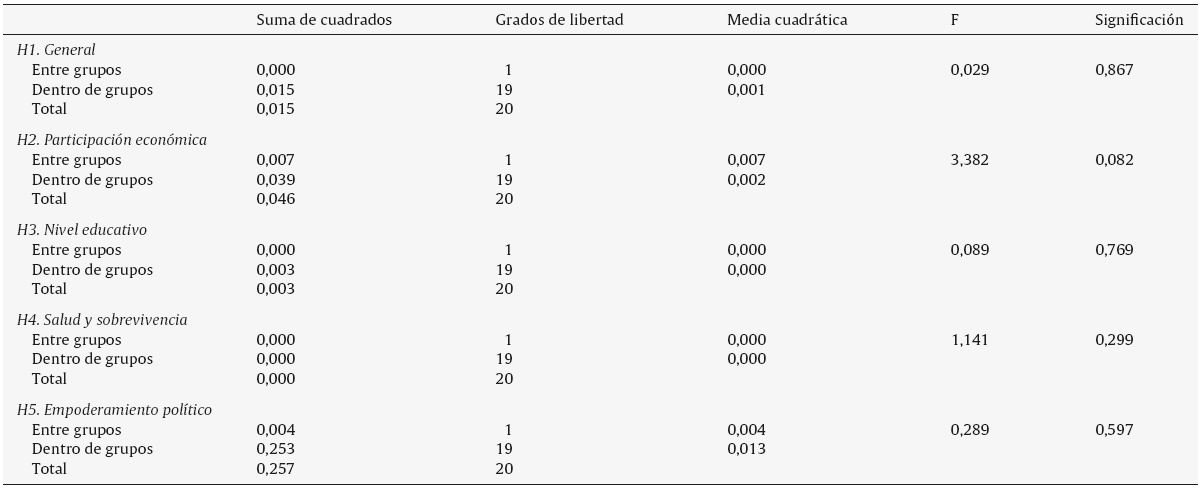 Además de la observación numérica de las medias entre ambos bloques, con el fin de comprobar si hay diferencia estadísticamente significativa entre las variables que constituyen la brecha de género, separando el grupo de países de la Alianza del Pacífico del resto de los países que conforman Latinoamérica, se llevaron a cabo pruebas ANOVA. Las pruebas de ANOVA permiten determinar si hay diferencia estadísticamente significativa en brecha de género analizando ambos bloques de países, por lo que se procedió a validar las siguientes hipótesis de investigación:
