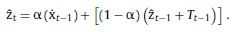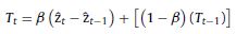 es la suavización exponencial del periodo t-1; Tt corresponde a la tendencia del periodo t;Tt−1 corresponde a la tendencia del periodo t-1; α es el coeficiente de suavización (entre 0,0y 1,0),y β es el coeficiente de suavización para la tendencia (entre 0,0y1,0).