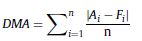 La DMA es una de las formas más populares para el cálculo del error debido a que es fácil de comprender y de aplicar. Esta se define como el promedio de todos los errores de la proyección en valores absolutos, es decir, independientemente de que los errores sean positivos o negativos (ecuación 8).