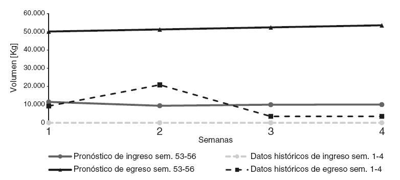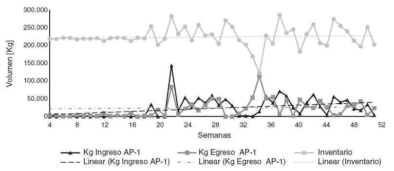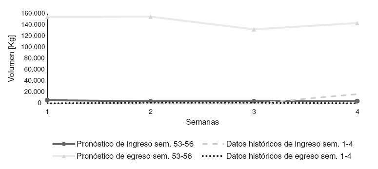 De forma particular, se destaca que para los 4 periodos de estudio, los volúmenes de egreso de los productos seleccionados son superiores a los volúmenes de ingreso, con un promedio de 183.600 kg de producto. Este desabastecimiento representa el 99,5% de los productos. De los resultados obtenidos, se puede destacar el comportamiento de uno de los productos, el AP-1, el cual contrasta con los datos históricos analizados ya que el movimiento en el egreso hasta las primeras 18 semanas es casi nulo y, posteriormente, a partir de la semana 19, muestra una tendencia creciente de egresos. Respecto al producto NE-2, se estima un crecimiento promedio en el egreso de 146.200 kg, respecto a los ingresos, para los 4 periodos de análisis.