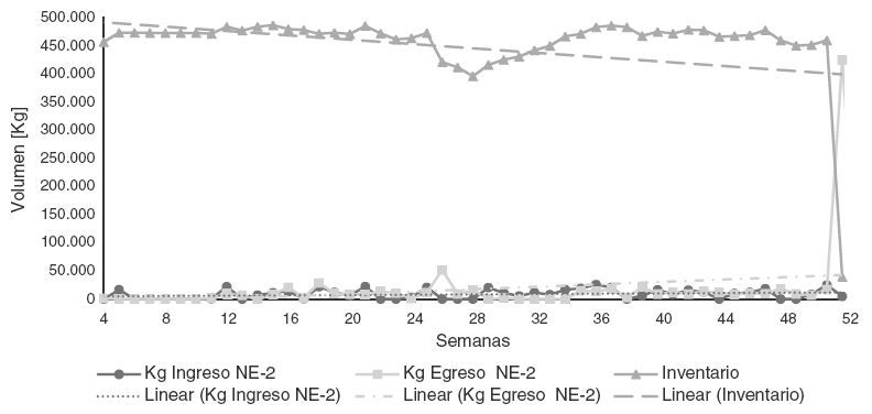 El comportamiento del producto NE-2 se ha representado en la figura 2, en la que se observa una situación totalmente diferente a la del producto AP-1. Se muestra que desde el inicio del periodo hasta la semana 51 el inventario del producto oscila entre 450.000 y 500.000 kg, donde el inventario inicial es de 444.000 kg, representando el 30% del inventario total de los productos en la cámara frigorífica. La cantidad de este producto en el almacén durante el periodo de análisis es constante, excepto en las semanas 24-33, que es cuando se presenta la mayor movilidad del producto, con un ingreso superior de 306 kg, con respecto al egreso. Cabe notar que la semana 28 presenta uno de los inventarios más bajos del periodo, con una cantidad de 395.394 kg. Además, uno de los niveles de inventario más alto se ubicó en la semana 24, con la cantidad de 531.771 kg. Particularmente, en la semana 52, la última del periodo, se presenta una drástica caída del inventario del producto, quedando un 4% del inventario del producto NE-2. Finalmente, el promedio del inventario para ese periodo fue de 432.335 kg.