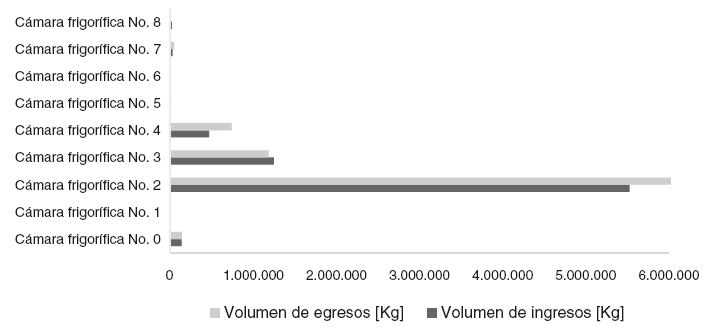 Por otra parte, la figura 3 comprende el volumen de ingreso y egreso en cada cámara, en donde se destaca el alto número de movi mientos que se presentan en la cámara frigorífica n.° 2. Esta cámara representó en el periodo de estudio el 64,31% de ingreso y el 73,96% de egreso del total del volumen de movimiento.