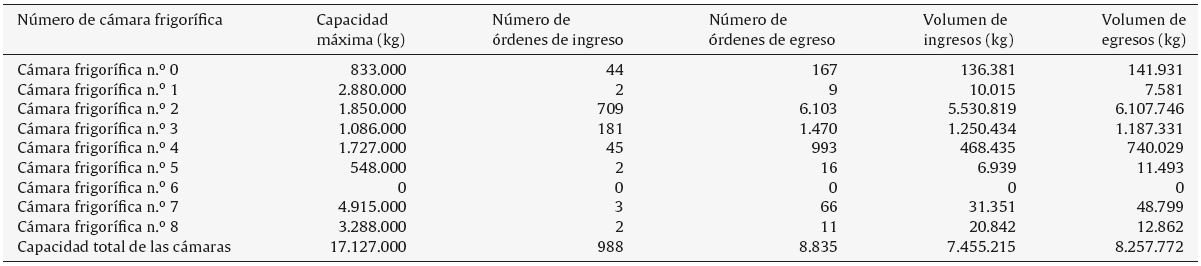 La empresa cuenta con 9 cámaras frigoríficas; la tabla 1 describe la capacidad máxima de almacenamiento por cámara, así como el número de órdenes y el volumen de ingreso y egreso generados en un periodo de 12 meses.