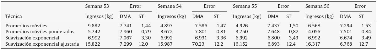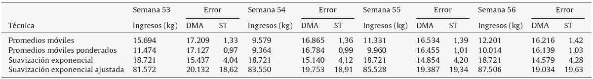 En el presente caso de estudio, los datos que se consideraron para las técnicas de pronósticos son: para promedio móvil, n = 3; en el promedio móvil ponderado, su factor de ponderación fue Ci = 20% para el periodo más lejano, 30% para el periodo intermedio y 50% para el periodo más reciente, lo cual es coherente con lo mencio nado por Sipper y Bulfin (1998), quienes señalan que los periodos más recientes suavizan las fluctuaciones. Por otra parte, para la técnica de suavización exponencial α fue 0,1, 0,2 y 0,3; y para la suavización exponencial ajustada, se consideraron constantes de suavización tanto de α como de β de 0,1, 0,2, 0,3, considerando la selección de estas constantes como criterios de precisión, respuesta de impulso y capacidad de amortiguación de ruido (Fogarty et al., 2014).