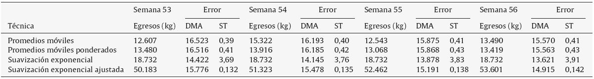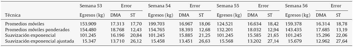 Las tablas 2 y 3 muestran los resultados obtenidos de las 4 técnicas de pronósticos aplicadas, representadas en la sección 2, para los volúmenes de movimiento de los productos AP-1 y NE-2 de la cámara frigorífica n.° 2. Inicialmente, la tabla 2 ilustra el pronóstico de volumen de ingreso del producto AP-1 para las semanas 53 a 56. De esta forma, para la semana 53 se predicen 11.474 kg a través de la técnica de promedios móviles ponderados, observando que este es el volumen más pequeño pronosticado; mediante la técnica de suavización exponencial ajustada, se presenta un volumen con el valor más alto representado por 81.572 kg, y con la técnica de promedios móviles ponderados se presenta el error más pequeño comparativamente con las otras 3 técnicas aplicadas, siendo de 0,97, y la DMA relacionada con este valor es de 17.127 kg, lo cual implica una tendencia sobrestimada del pronóstico. Dicho de otra manera, el pronóstico será de forma positiva o creciente con base en los datos históricos. Adicionalmente, se identifica que, para las semanas 53, 54 y 55, el error más bajo lo representa la técnica de promedios móviles ponderados. De esta manera se identifica que los datos obtenidos del pronóstico del volumen de ingresos del producto AP-1 con la técnica de promedios móviles ponderados son los más aceptables para considerar dentro de la planeación de movilidad.