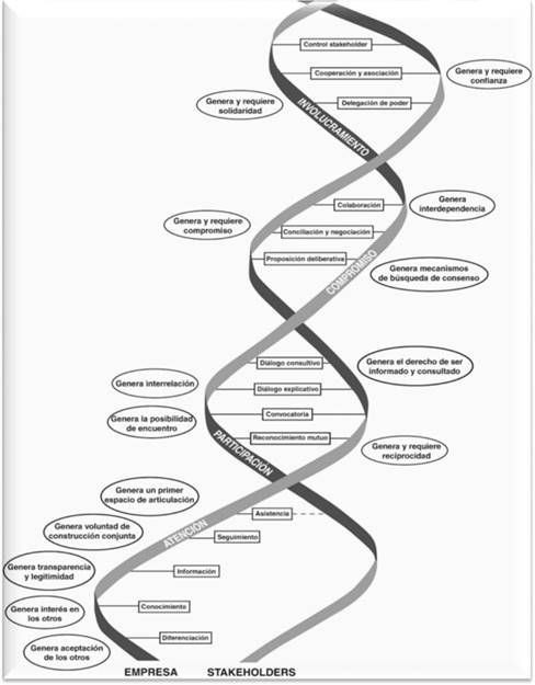 En función de la esencia de los vínculos que se generan entre las empresas y sus stakeholders, para su representación gráfica se adopta una imagen que además de mostrar la concatenación de las fases, proporciona la idea de que cada etapa representa una profundización de los vínculos, un continuo entrecruzamiento entre los diferentes actores que participan de la relación. La elección de una figura basada en la gráfica del ADN no es casual pues así como este al contener la codificación de las proteínas, y siendo que estas al ser diferentes para cada especie producen que cada una tenga su propia codificación, de manera similar cada empresa tendrá su propia sucesión de pasos para llegar a la participación, compromiso e involucramiento de sus stakeholders, y esa sucesión de pasos será diferente a la de otras empresas. La versión gráfica puede verse en la figura 4.