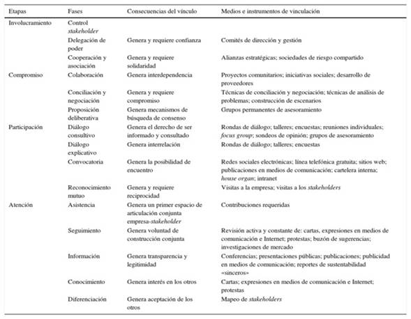Las distintas etapas y fases del método de integración gradual de los stakeholders no accionariales a los procesos decisorios de las empresas se muestran en la tabla 1, en la que también se expresan las consecuencias más evidentes del vínculo generado. De manera similar a los modelos tomados como referencia, este método procede de manera escalonada, tal como si cada fase fuese un peldaño que partiendo desde una base determinada llega a la parte superior paso a paso.
