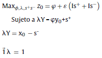 [5]Donde φ denota la puntuación de eficiencia; λ es el vector (nx1) de pesos o intensidades; Y es la matriz de outputs de orden sxn; y0 representa el vector output de la unidad que está siendo evaluada; X es una matriz de inputs de orden mxn; x0 representa el vector inputs de la unidad que está siendo evaluada; Is+ es el vector de holguras output, e Is− es el vector de holguras input.