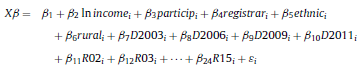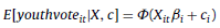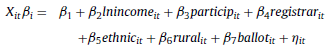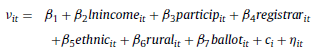 [15]where Φ(·) is the standard normal cumulative distribution function, the regressors lnincome, particip, ethnic, registrar, rural, and ballot are defined as above, ηit is the idiosyncratic error, and the unobserved heterogeneity ci is distributed