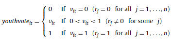 [11]where youthvoteit denotes the voter-registration rate, i.e. youth vote ratio, in county i at time t, rj is the enrollment decision of a citizen j that resides in a county populated by n individuals, and it