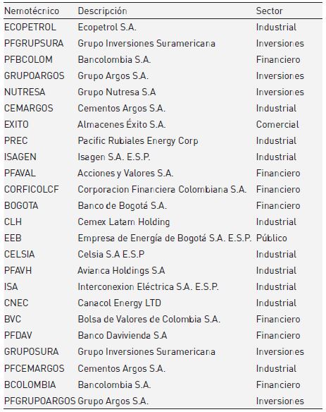 En este artículo se toma como alternativa de inversión la Bolsa de Valores de Colombia (BVC), la cual puede ser representada por el índice COLCAP. El COLCAP está compuesto por las acciones más líquidas de la BVC (mínimo 20), en donde la participación de cada una de ellas se calcula en función del valor de la capitalización bursátil ajustada. Los datos analizados corresponden a las acciones del índice COLCAP del primer trimestre de 2016, siendo este el periodo más reciente con información disponible al momento de iniciar la experimentación computacional y su respectiva validación. No obstante, la metodología planteada es totalmente independiente de las acciones utilizadas, y podría usarse cualquier periodo que se considere de interés. Los nemotécnicos, los nombres de las compañías y los sectores a los cuales pertenecen de acuerdo con la clasificación de la BVC se describen en la tabla 1. Nótese que el uso de las acciones del índice COLCAP favorece la obtención de un portafolio de alta liquidez, lo cual es de interés para los inversionistas y más aún cuando se tienen horizontes de tiempo cortos.