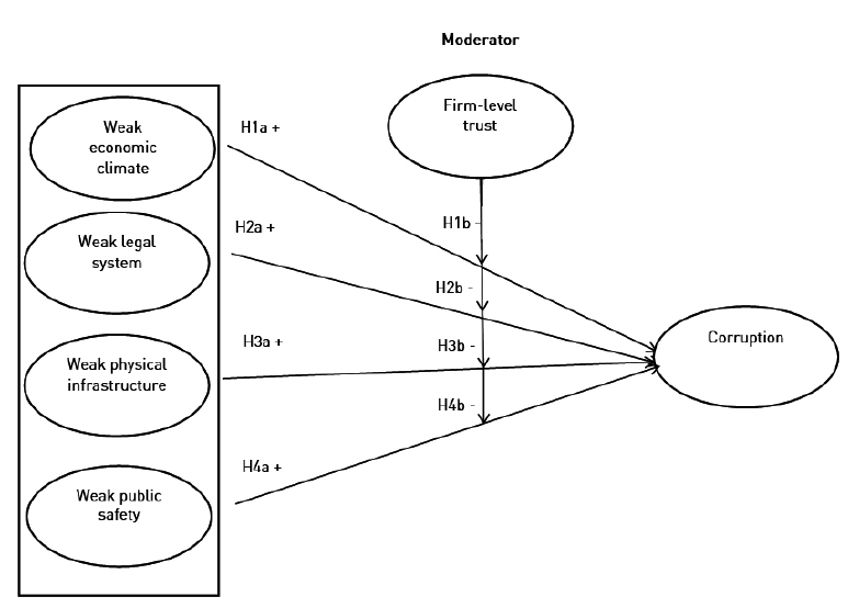 This paper is structured as follows: section 2 provides the theoretical framework and hypotheses; section 3 explains the methods used to analyze empirically the weak institution - perceived corruption relationship and the moderating effects of firm-level trust; section 4 discusses the results; and finally, section 5 offers conclusions, recommendations for practice and research, and limitations.