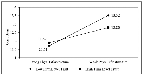 Yet trust can change that association. Where perceived corruption is high and physical infrastructure is weak, people who have high levels of trust in the firms they work for will perceive the physical infrastructure - corruption relationship to be weaker. Employees who have high firm-level trust are likely to think that physical and other conditions in which they work are positive, surmising that the firm takes care of them in a way that prevents them from being distracted by weak physical infrastructure outside the firm. People who have high firm-level trust think their firms have found ways to overcome the problems that result in poor or unattended infrastructure, because those kinds of conditions do not exist in their firms. In fact, high firm-level trust suggests there is limited or no corruption in the firm, so people believe corruption is not as strongly associated with the country’s weak physical infrastructure.