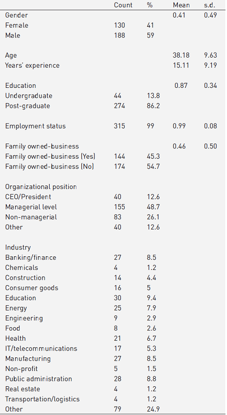 Recognizing that this was a convenient sample, a descriptive analysis indicates that the sample is representative of a broad based industry and employment level. The sample of individuals we surveyed included owners, CEOs, presidents, general managers, directors, supervisors and employees. It reflects a population of active and engaged business professionals, and is stratified enough to present an array of individual-level perceptions about corruption, public institutional strength, and firm-level trust. We received 548 responses and due to missing data, 318 were usable: 93 of the subjects were from Mexico, and 225 were from Peru. The average age was 38, with 41% female and 59% male. We controlled for education, with 14% of the respondents having an undergraduate degree and 86% holding a post-bachelor degree. Nearly 45% of respondents were associated with a family-owned business. We also controlled for position within the firm and industry. Finally, we measured firm size by the number of employees (avg. = 4622.59, s.d., 28260.54). As a result, we believe this sample adequately represents a cross section of business and managerial participants. Table 2 highlights the independent and dependent variables descriptive statistics and correlations. Table 3 highlights the control variables’ descriptive information, including percentages.
