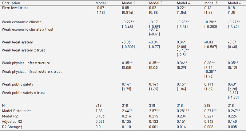 We used stepwise linear regressions to test our hypotheses. Table 4 tests the first hypothesis relating to corruption. For each model, we controlled for age, gender, education, employment status, family owned business, years’ experience, managerial position, size of firm, and industry; however, due to space considerations we only present the independent and dependent variables. Model 1 on table 4 shows the effects of firm-level trust on corruption (β=-0.07, p = 0.24), reflecting the argument that the trust - corruption relationship is more complex than the simple direct effect. Subsequent models build upon the direct effect, highlighting each institutional variable relationship to corruption, followed by the interactive effect of that institutional construct with firm-level trust.
