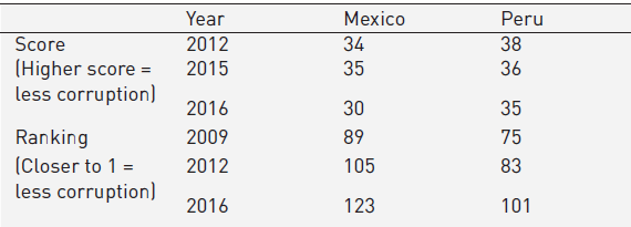 We administered surveys to approximately 550 managerial level, working professionals enrolled in graduate and executive business education studies at universities in Mexico and Peru in late 2012. We selected Mexico and Peru because both countries are emerging markets that in the last two decades, underwent significant institutional reforms to make them more stable and economically viable (Ciravegna et al., 2016). In addition, and despite these reforms, both countries continue to experience significant, increasing levels of corruption. According to Transparency International (2016), the latest available at this writing, Mexico’s ranking on the Corruption Perceptions Index (CPI) worsened, moving from 89 in 2009, to 123 in 2016, suggesting corruption has increased in recent years. Peru’s CPI suggests it has experienced a similar increase in corruption over time, as its ranking moved from 75 in 2009, to 101 in 2016. Table 1 illustrates this and other related indices as a point of reference.