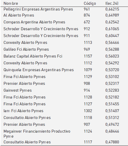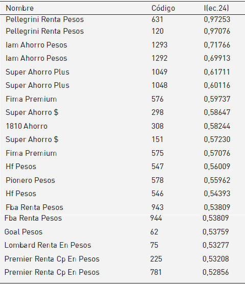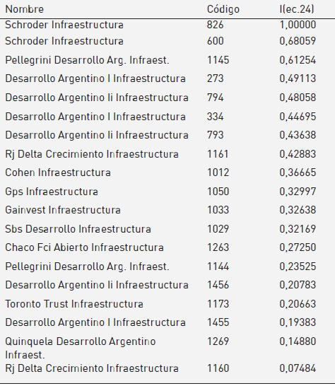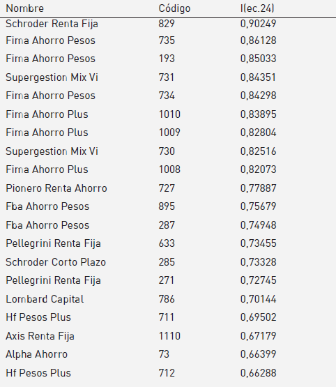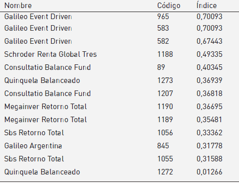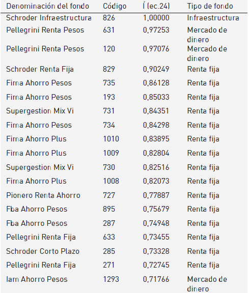 Producto de aplicar el índice propuesto al caso de estudio, la tabla 2 presenta las primeras 40 posiciones de fondos comunes, en función del desempeño observado para el periodo 2016. Las 15 primeras posiciones son ocupadas por fondos del tipo infraestructura, mercado de dinero y renta fija.
