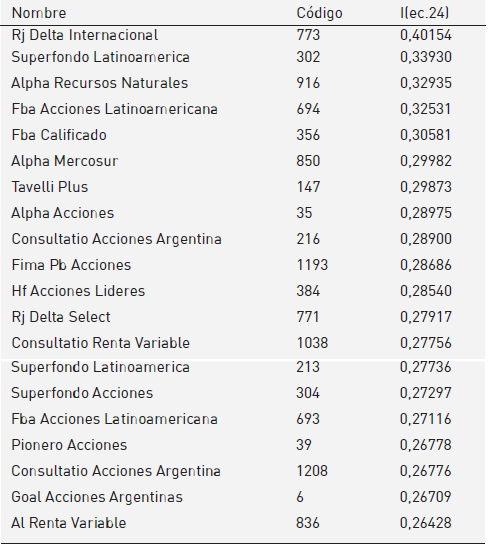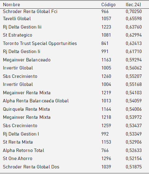 (25)El resultado obtenido aplicando la ecuación 24 en cada fondo evaluado permite elaborar un ranking de acuerdo a su desempeño evaluado de manera multidimensional. Aquellos fondos con índices más próximos a la unidad serán los de mejor comportamiento conjunto para las nueve métricas consideradas de interés.