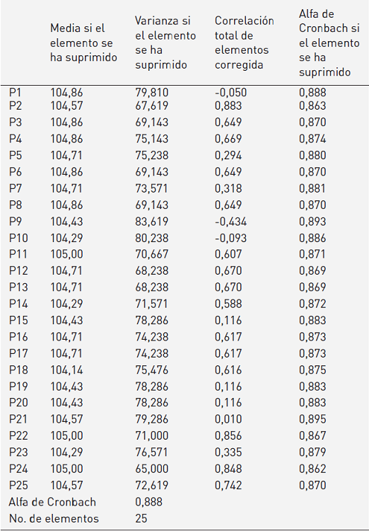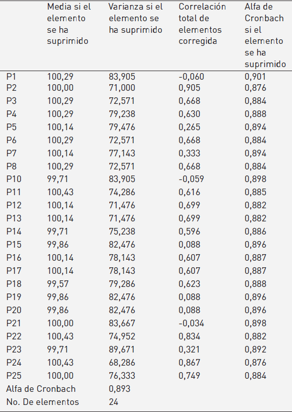 Al realizar nuevamente el análisis de confiabilidad considerando la exclusión del ítem 9, se observa mejoría en el valor del coeficiente de Alfa de Cronbach que llega hasta 0,893 (tabla 4), lo que según Muñiz et al. (2005) es un valor bueno que garantiza la validez y confiabilidad del instrumento a utilizar. Observando los índices de discriminación mostrados en la tabla 4, se pueden identificar tres ítems (P1, P10 y P21) con valores negativos y que en el caso que se tome la decisión de eliminarlos de la prueba se podría aspirar a alcanzar un Alfa de Cronbach cercano a 0,901. Por decisión de los autores del presente artículo se concluye que dichos ítems se dejaran en la prueba a pesar de su escaso poder de discriminación.
