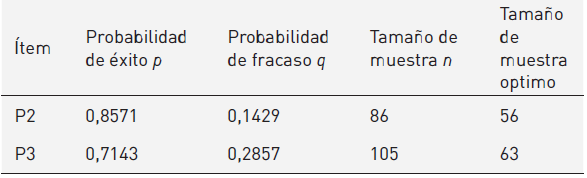 Los valores de p y de q fueron determinados a partir de los resultados derivados de la prueba piloto de la que se seleccionaron dos ítems asociados a la categoría de “Sistema de Gestión de la Calidad” dentro del instrumento aplicado, y considerando que, dado que el instrumento utiliza una escala Likert a cinco niveles, para valorar el nivel de aceptación o de cumplimiento (p) de cada aspecto, se definió como éxito la suma de las frecuencias absolutas de las calificaciones de 4 y 5, y el fracaso (q) como la suma de las frecuencias absolutas cuyas calificaciones van de 1 a 3; con ambas frecuencias se calcularon los cocientes y se determinaron las respectivas probabilidades de cada caso.
