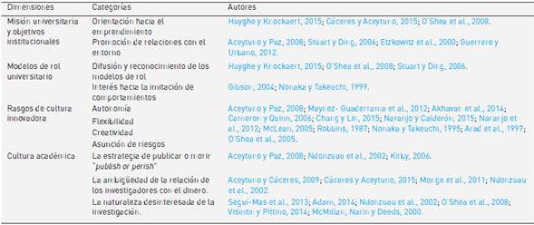 Inicialmente, la misión y objetivos permiten visualizar la cultura desde la declaración de propósito, filosofía, principios y creencias de la organización que guían los comportamientos individuales (Huyghe y Knockaert, 2015). Respecto a los modelos de rol, se asumen por cuanto son formadores de tradición, que es un elemento fundamental en la cultura (Gibson, 2004). Por otra parte, los rasgos innovadores se incluyen en el modelo por la estrecha relación que se ha evidenciado entre la innovación y el emprendimiento corporativo (Naranjo, Calderón, Jiménez y Sanz, 2018). Finalmente, la cultura académica es considerada un elemento cultural determinante, pues explica la tensión entre los paradigmas de la concepción científica y la concepción económica, que cuando es muy ortodoxa puede inhibir el emprendimiento académico (Ndonzuau et al., 2002). A continuación se realiza la sustentación de cada categoría, fundamentados en estudios previos.