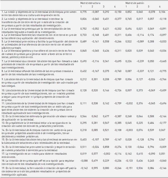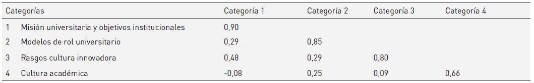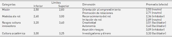 Otra limitación es la no inclusión en el presente análisis de tres dimensiones culturales que la literatura considera importantes para el emprendimiento académico: la flexibilidad como rasgo de la cultura innovadora, la naturaleza desinteresada de la investigación, y la estrategia de publicar o morir (Cameron y Quinn, 2006; Seguí-Mas et al., 2013; Aceytuno y Paz, 2008; Ndonzuau et al., 2002); las últimas dos como parte de la cultura académica. Estas características no se consideraron por cuanto el análisis factorial exploratorio las descartó, posiblemente porque estos procesos son nacientes en el contexto universitario nacional y aún no se consolida una cultura académica que incentive estas actividades.
