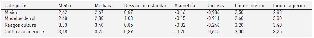 A partir de la literatura mencionada se elaboró el presente modelo estructurado en 4 categorías con sus respectivas dimensiones: misión y objetivos institucionales, modelos de rol, rasgos de cultura innovadora y cultura académica (figura 1).