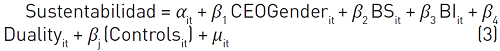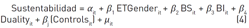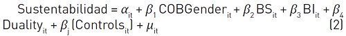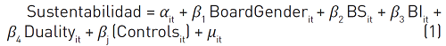 El análisis empírico busca analizar si la participación fe menina en el consejo de administración y equipo directivo, inciden en el nivel de cumplimiento en sustentabilidad en sus dimensiones económica, ambiental y social. Las ecuaciones [1], [2], [3] y [4], muestran los modelos adoptados en la investigación. Los modelos 1 y 2 muestran la relación de la participación de mujeres en el consejo de administración sobre la sustentabilidad en sus dimensiones económica, ambiental y social. Los modelos 3 y 4, estudian la influencia de las mujeres en el equipo directivo sobre el cumplimiento sustentable.