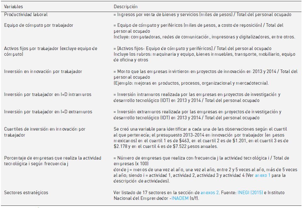 La cobertura de la ENAPROCE es nacional y presenta información para cada una de las 32 entidades federativas de México y para conjuntos de actividades económicas denominados sectores estratégicos (ver anexo 2). Cada entidad federativa cuenta aproximadamente con siete sectores estratégicos. La conformación de estos sectores estuvo a cargo del Instituto Tecnológico y de Estudios Superiores de Monterrey (ITESM) y de los gobiernos estatales. El operativo de campo para la captación de la información se desarrolló durante los meses de junio y julio del año 2015 (INEGI, 2015). El interés de la presente investigación se centra en los esfuerzos innovadores y su impacto sobre la productividad, para lo cual se construyó la variable de productividad laboral. De esta forma, un aumento de la productividad reflejaría mayores ventas por trabajador y un uso más eficiente de los insumos. En la tabla 1 se presenta la descripción de las variables que se utilizarán en el presente análisis.
