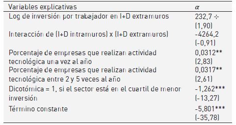 En la ecuación [2] se destaca el parámetro α3 que mide el efecto conjunto de la IDT intramuros y extramuros. El valor de α3 puede ser positivo o negativo, dependiendo de la naturaleza de complementariedad o sustituibilidad entre los esfuerzos intramuros y extramuros. Se espera que los parámetros α1, α2,…,α5 tomen valores positivos, toda vez que más IDT o más actividad tecnológica promueven más proyectos y más inversión en innovación. Por construcción, se espera que α6 tome un valor negativo, dado que registra la diferencia de inversión en los sectores con menores montos destinados a innovación.