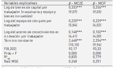 La estimación en la primera etapa permitió obtener información relevante de la variable endógena, la cual se usó en la segunda etapa sin los problemas usuales que surgen en presencia de variables endógenas, como son: (a) el sesgo por omisión de variables no observadas, (b) el sesgo por causalidad simultánea y (c) el sesgo por errores en la medición de las variables. De esta manera, se utilizaron los valores predichos de ij en la ecuación [2] para estimar eficientemente la ecuación [1]. En la tabla 4 se reportan los coeficientes obtenidos mediante este procedimiento en dos etapas (β − MC2E) y se ofrecen a modo de comparación los coeficientes (β − MCP) que se obtienen al estimar [1], sin instrumentar la variable de capital innovador.