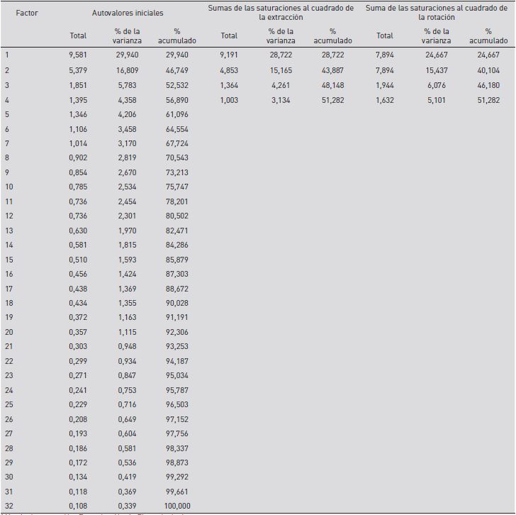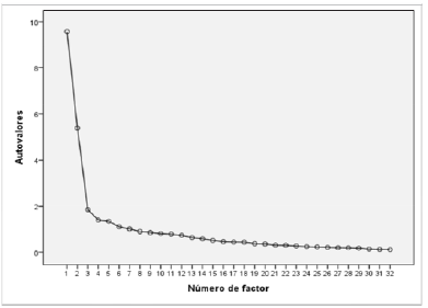 Según se observa en la tabla 5, el primer factor explica un 29,94% de la varianza; el segundo, un 16,809%; el tercero, un 5,783%; y el cuarto, un 4,358%, llegando a explicar de manera conjunta estos factores un 56,89% de la varianza total. Los siguientes factores explican porcentajes inferiores, pudiendo considerar que la selección de estos 4 primeros factores es la más apropiada, reduciéndose la dimensionalidad de 32 a 4. Como se sabe, se han seleccionado los factores cuyo autovalor es superior a 1, lo cual lleva cierta pérdida de capacidad explicativa, pero lo importante es que esta pérdida no sea significativa y con la elección de los 4 factores que se ha realizado la pérdida es realmente pequeña.