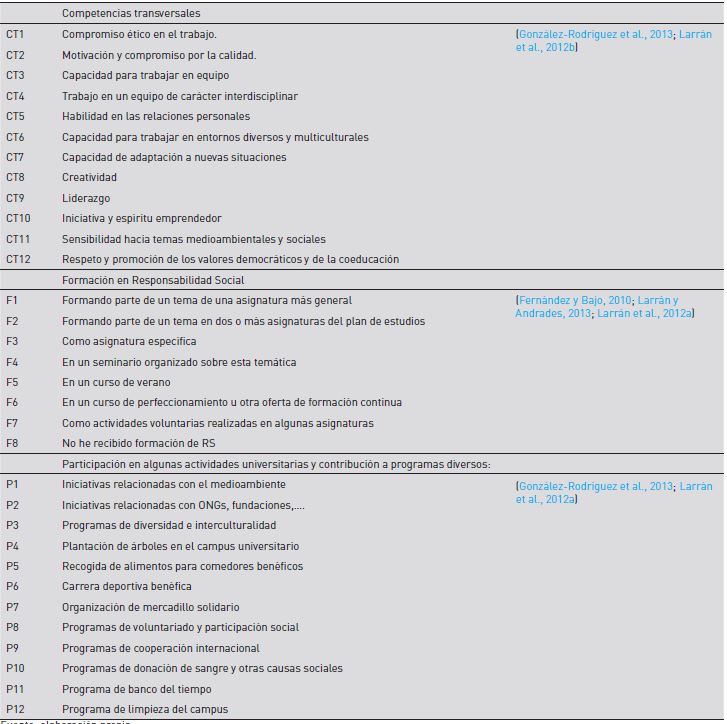 Como ya pusieron de manifiesto Gallardo y Castilla (2016, p. 3) “diversos autores han tratado el tema de la valoración de las competencias y de su relevancia para el estudiante universitario” desde una óptica global y sin diferenciar entre RS y ética empresarial, cuestión criticada por Larrán y Andrades (2015b). Bajo la opinión de estos últimos autores conviene enfatizar entre el papel de la conducta empresarial en el ámbito de la ética y las consecuencias derivadas de la actividad empresarial que se asocian a la RS.