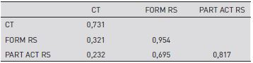 Estos cuatro factores obtenidos del análisis factorial exploratorio constituyen las dimensiones de las competencias transversales, formación en RS y participación en actividades. Resulta de utilidad el cálculo de los coeficientes α de Cronbach para cada uno de los factores, como si se tratara de pequeñas escalas, con el objeto de observar la correlación entre las variables. Así, se han determinado los siguientes coeficientes: α1 = 0,948; α2 = 0,877; α3 = 0,904; α4 = 0,774. Como se observa, todos los valores del α de Cronbach para cada uno de los factores son superiores a 0,7, lo cual indica que son buenos en todos los casos. Esto determina la consistencia interna de los ítems que componen la escala.