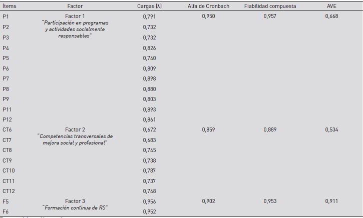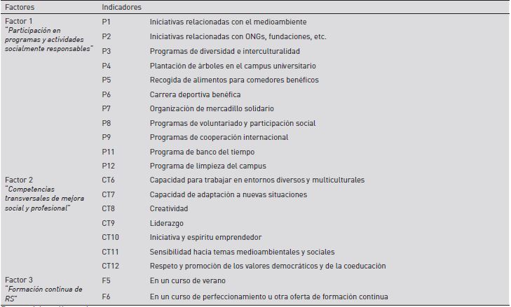 Con estos tres factores se integraría el diseño de la escala específica de RSU orientada al estudiante universitario, compuesta por las CT relativas a la RS orientadas a la sostenibilidad, la formación de RS y la participación del estudiante en actividades con carácter igualmente ético y responsable.