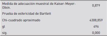 Observando los valores obtenidos, se obtuvieron resultados adecuados. El valor de la significancia del test de Bartlett fue de 0,000 (inferior a 0,100). Con relación al estadístico KMO tomó el valor de 0,879, superior a 0,6, lo cual indica que los datos muestran una buena calidad para realizar el AFE.