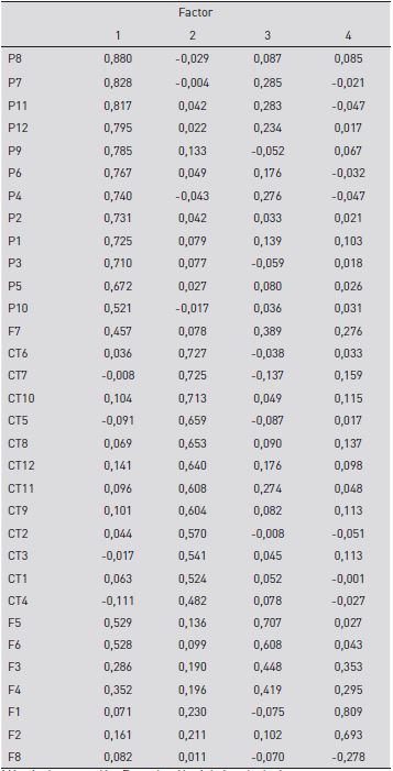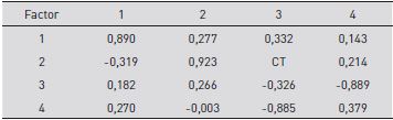 Una vez elaborada la matriz factorial no rotada, resulta difícil de interpretar. Ante ello, y al haberse observado la recomendación de extraer 4 factores, es imprescindible obtener una matriz adicional de factores rotados (Carroll, 1953). Al rotar, los indicadores se colocan más cerca de los factores diseñados, a la vez que la varianza de los mismos se concentra en menos factores, facilitándose la interpretación de la matriz obtenida (Kaiser, 1958). El objetivo de la rotación, de acuerdo con Pérez y Medrano (2010), es llevar a cabo una eliminación de las correlaciones negativas importantes, lo que produciría la reducción del número de correlaciones de cada ítem en los diversos factores.