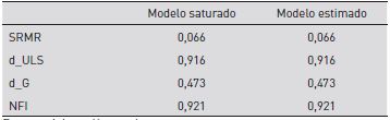 La evaluación del índice normalizado de la raíz cuadrada residual (SRMR) ofrece un valor satisfactorio de 0,066 (tabla 8), que está por debajo del límite habitual de 0,08 propuesto por Hu y Bentler (1998). En relación con las pruebas de ajuste d_ULS y d_G, realizadas mediante estadísticas de inferencia basadas en bootstrapping (Henseler et al., 2016), se han obtenido valores de 0,916 y 0,473, respectivamente, inferiores al percentil del 95%, por lo que se ha determinado que la discrepancia existente no es significativa. Por otra parte, el modelo alcanza un nivel aceptable en el NFI, al superar el valor mínimo recomendado por Escobedo, Hernández, Estebané y Martínez (2016), quienes señalan un nivel de ajuste aceptable para NIF >0,90 (0,921>0,920). En la tabla 8 aparecen reportados los distintos índices de ajuste analizados.