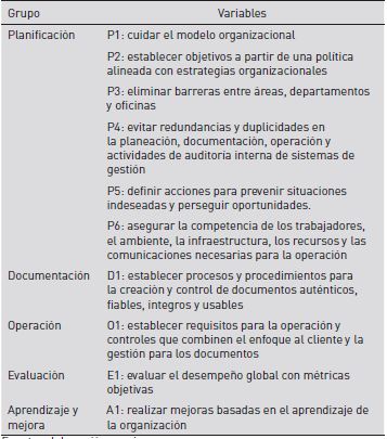 Las variables tienen implícita la sinergia entre la organización, los SGC, los SGD y otros sistemas adoptados por la organización. Por ejemplo, el término ‘política’ dentro de la variable P2, hace referencia a una única política que integra aspectos de la compañía, de los SGC, de los SGD y de otros sistemas de gestión.