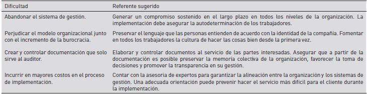 Ahora bien, durante la implementación de los SIG es posible encontrar desviaciones que pueden representar dificultades durante el proceso. Algunos autores señalan que la falta de compromiso por parte de la alta dirección se identifica como la principal causa de abandono de los SIG (Bernardo, Casadesus, Karapetrovic y Heras, 2012a). Por lo tanto, en la tabla 2 se incluye una serie de dificultades con potencial de ocurrencia y referentes para superarlas, con base en la literatura (Bustelo, 2013; Gianni y Gotzamani, 2015; Seddon, 1997).
