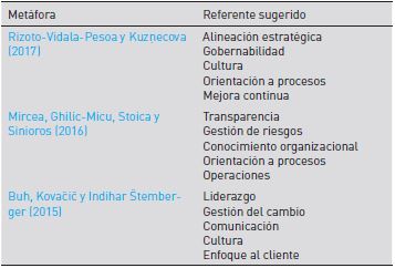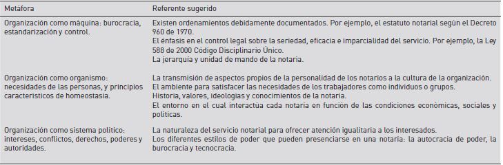 Tras discutir las dificultades y referentes sobre SIG, se sugiere que los directivos y solucionadores de problemas más eficaces son aquellos que están en la capacidad de realizar apreciaciones precisas de situaciones organizacionales desde diferentes perspectivas, ya que ofrecen diversos cursos de acción en torno al análisis organizacional. En la tabla 3 se presentan 3 metáforas organizacionales establecidas por Morgan que fueron alineadas en el contexto notarial como parte del estudio de organizaciones (Morgan, 2006; Piombino, 1996).