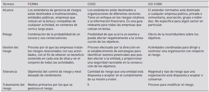 Gjerdrum, D. y Peter, M. (2011). The new international standard on the practice of risk management-A comparison of ISO 31000: 2009 and the COSO ERM framework. Risk Management, 31(21), 8-12.