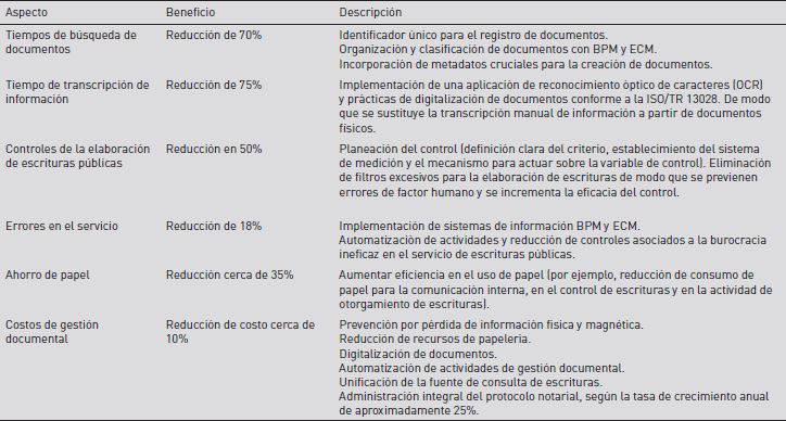 Ahora bien, los resultados de la caracterización del servicio de escrituras públicas tras la aplicación de la metodología de implementación de SIG, proporciona los siguientes beneficios puntuales de desempeño: reducción de tiempos en actividades; reducir aquellos controles que durante la elaboración de escrituras públicas no agregan valor al trabajo y se atribuyen a la burocracia ineficaz; reducir errores en el servicio; disminuir el consumo de papel y reducir costos de gestión documental. En la tabla 8 se describen brevemente los beneficios en el desempeño del servicio de escrituras públicas.