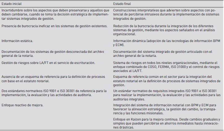Con el propósito de identificar los hallazgos en los cuatro pasos abordados en la sección de la metodología de implementación de SIG, se presenta en la tabla 9 un comparativo del estado inicial y final en la notaría objeto de estudio.